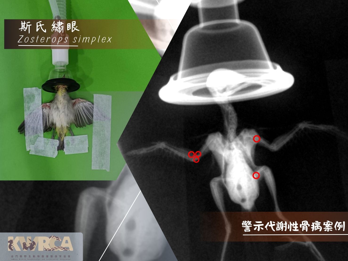 獸醫檢查後發現,這隻小繡眼的右翅肘關節、橈骨、肱骨,左翅肱骨與左股骨皆已骨折。診斷結果是:嚴重的代謝性骨病。