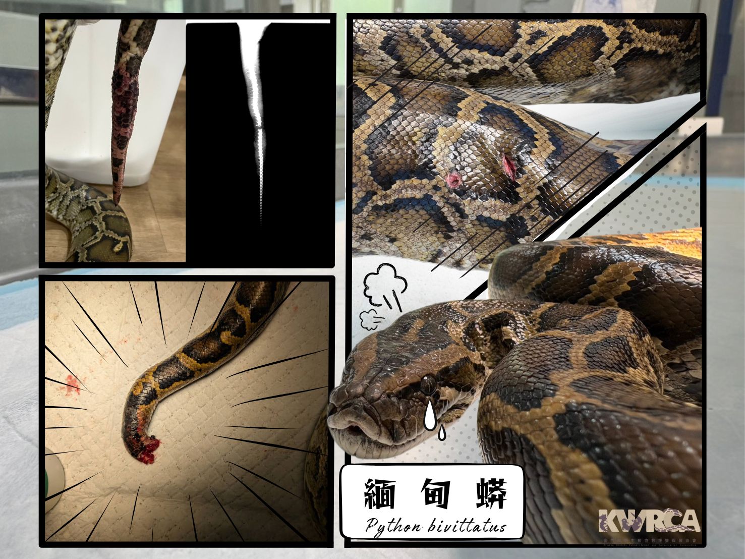 緬甸蟒的救傷原因通常不是纏網,就是人為攻擊,而「斷尾」可謂是兩毒俱全。在被雞舍網具纏住、動彈不得的情況下,牠又遭人狠打了一頓。