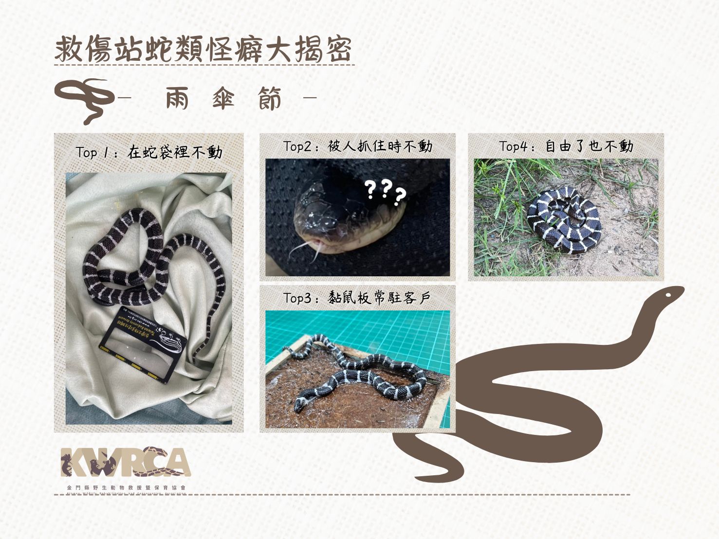 雨傘節如果有傷病,5成是被人攻擊,通常都不會存活;另外5成是因為中了黏鼠板,可能因為體型較小,棲息位置與人類部分重疊,雨傘節總是會被黏鼠板黏到。幸好黏到的都是鱗片,只需要小心控制牠的頭不要咬人,清理掉殘膠後就可以立刻野放!