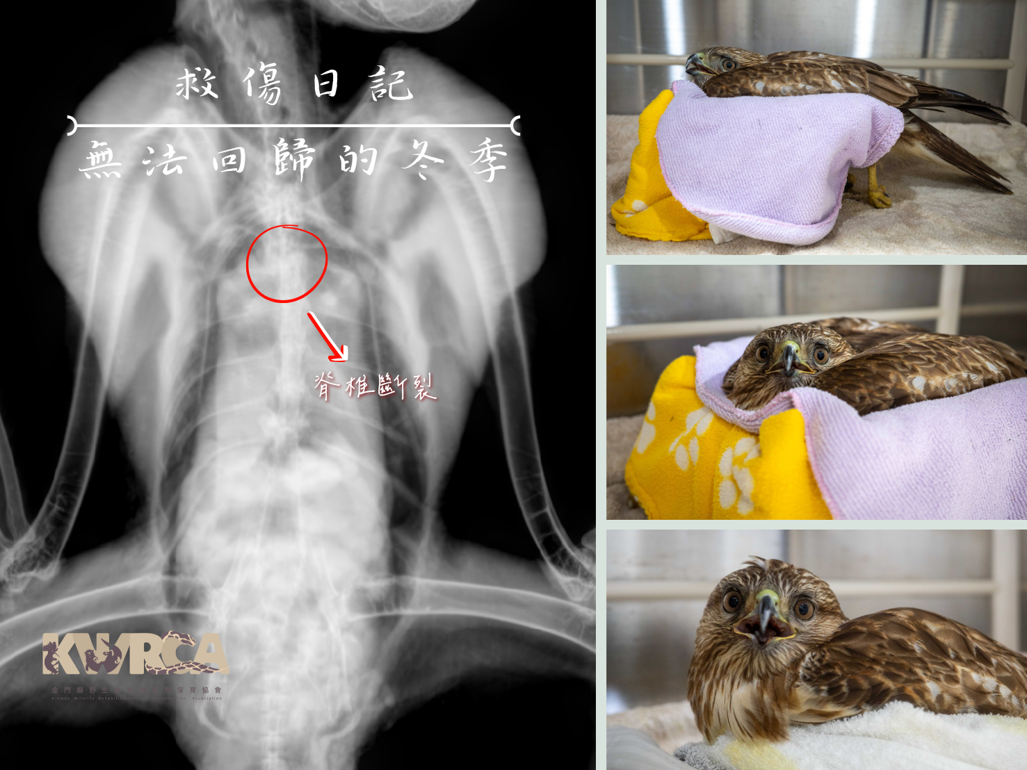 經過兩日的觀察和治療,東方鵟的精神恢復不少,甚至雙翼都能正常拍翅,唯獨雙腳依舊無法正常活動。於是,在身體狀況好轉之後,獸醫決定給予藥物鎮靜拍攝X光,這才發現這隻東方鵟的脊椎有嚴重斷裂錯位,因此而導致雙腳和下半身半癱,最終只能安樂送牠一程。